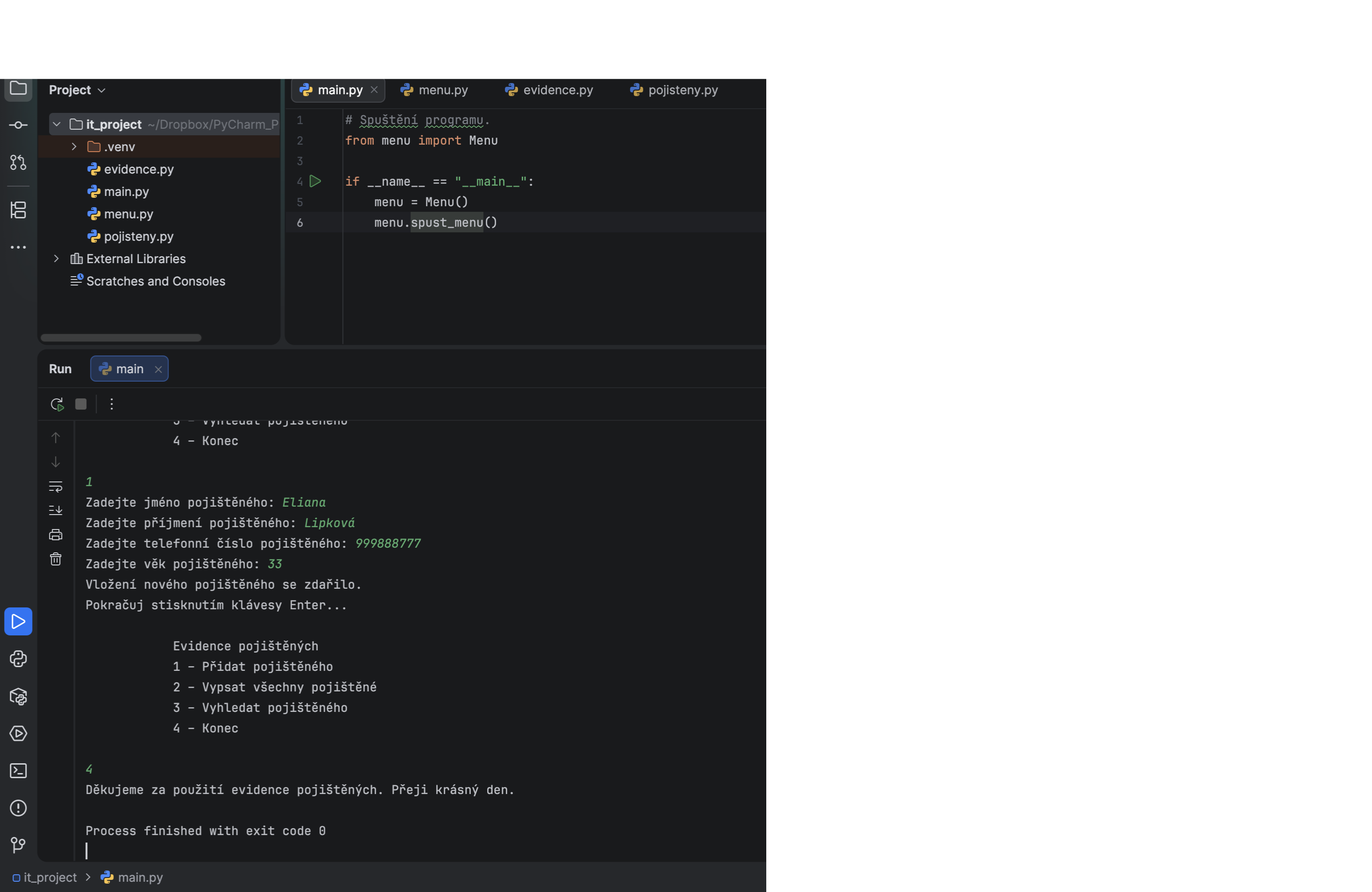 Konzolová aplikace v Pythonu pro správu pojištěných osob. Projekt je zaměřený na objektově orientované programování, validaci vstupů a práci s kolekcemi.